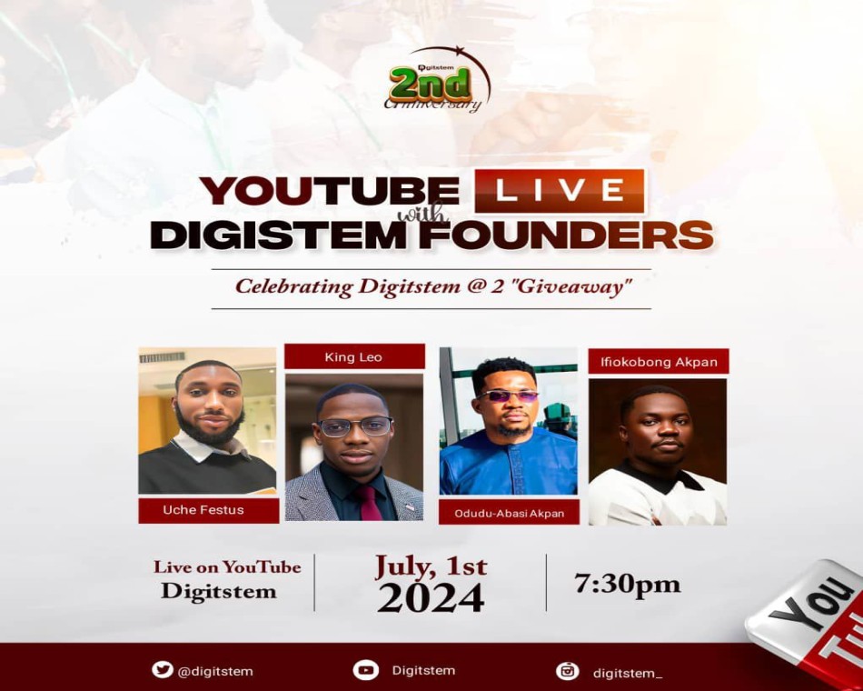 Join our co-founders LIVE on YouTube @Digitstem at 7.30PM WAT/6.30PM GMT for an Awesome time + incredible giveaway tonight!